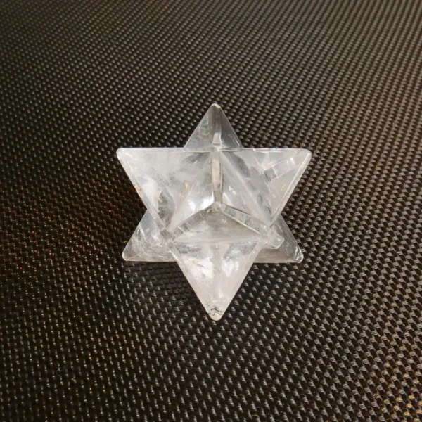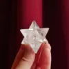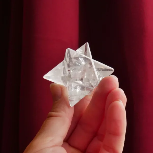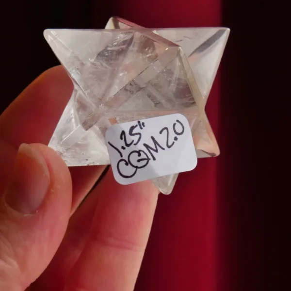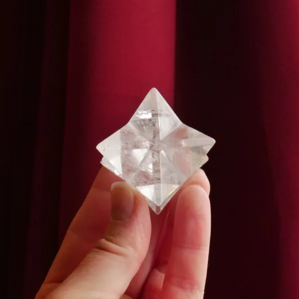 This stunning Clear Quartz Merkabah features sparkling clarity and lots of flashy rainbows. When held to the light, this piece glows! Beautifully polished, it will be a highlight in any collection. Our Double Merkabah carvings are hand carved by Brazilian artisans, and no two are alike. For best description, please see photos – you will receive the exact piece seen here. This piece measures 1.25″ in all directions and weighs 2 oz. Made from Clear Quartz, mined and polished in Brazil.