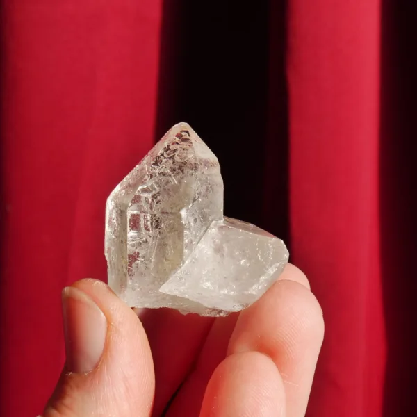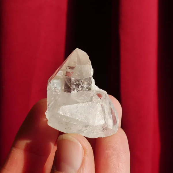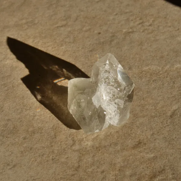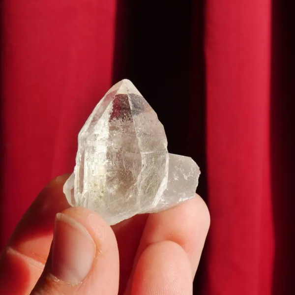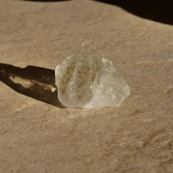 This lovely Lemurian cluster features two terminations, and thick glittery Starseed on one face – very small points and shards of quartz implanted or growing along the surface of another crystal. Lemurians feature ladder-like striations along one or more faces, and typically higher quality than regular quartz points. This miniature specimen measures 1.25″ at its largest dimension. From the Alegre mine in Bahia, Brazil.