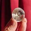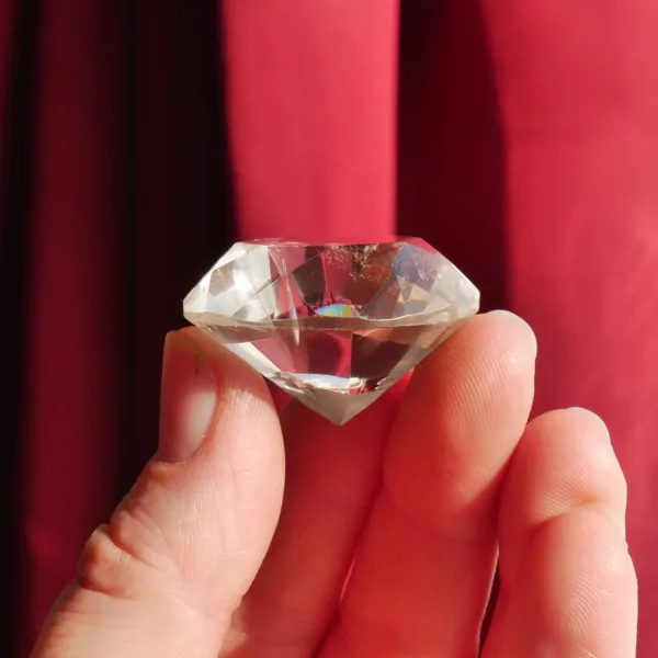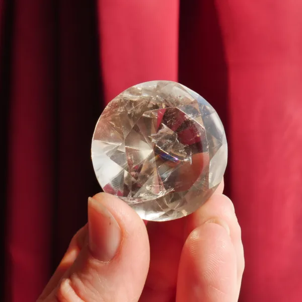 This Quartz diamond features sparkling clarity, lovely (natural!) light smoky coloring, and it flashes beautifully when it catches the light! A larger gemstone, this piece is best suited for display, or in custom jewelry pieces where an extra large stone is desired. This crystal diamond measures 1.25″ in diameter. Total weight is 119 Carats. Made from natural Smoky Quartz, mined and polished in Brazil.