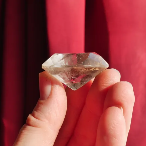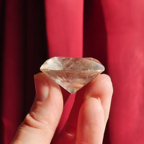 This Quartz diamond features sparkling clarity, lovely (natural!) light smoky coloring, and it flashes beautifully when it catches the light! A larger gemstone, this piece is best suited for display, or in custom jewelry pieces where an extra large stone is desired. This crystal diamond measures 1.4″ in diameter. Total weight is 130 Carats. Made from natural Smoky Quartz, mined and polished in Brazil.
