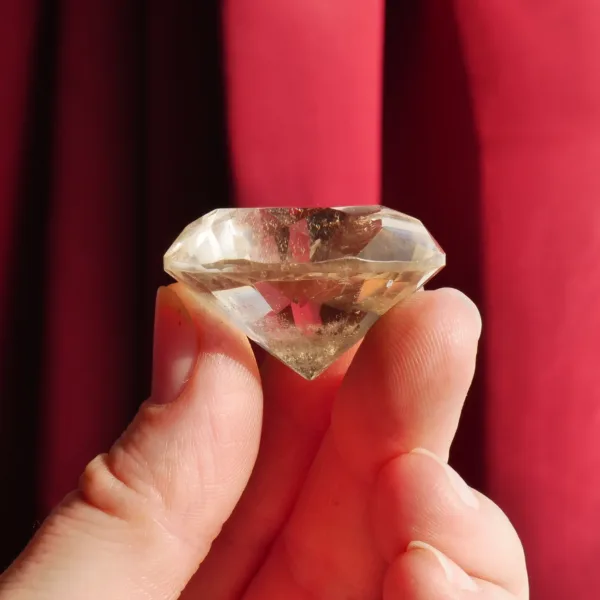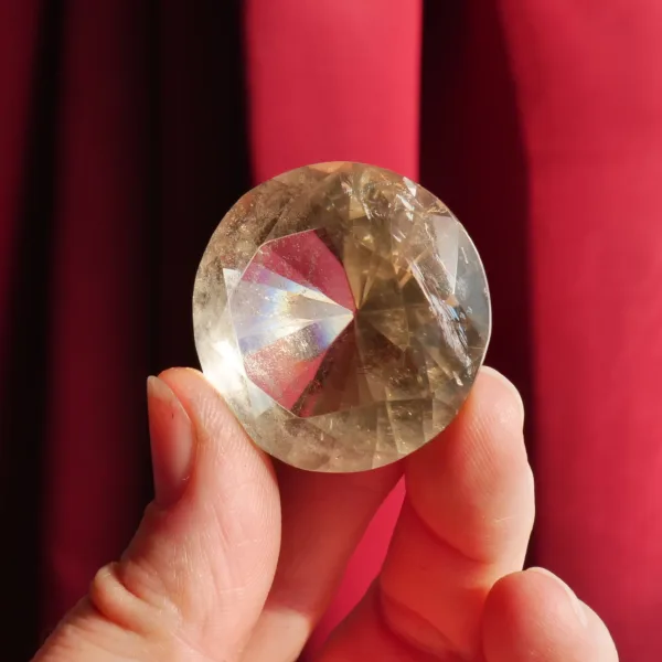 This Quartz diamond features sparkling clarity, highly sought after smoky-citrine coloring, and it flashes beautifully when it catches the light! A larger gemstone, this piece is best suited for display, or in custom jewelry pieces where an extra large stone is desired. This crystal diamond measures 1.4″ in diameter. Total weight is 130 Carats. Made from natural colored Smoky-Citrine, mined and polished in Brazil.
