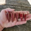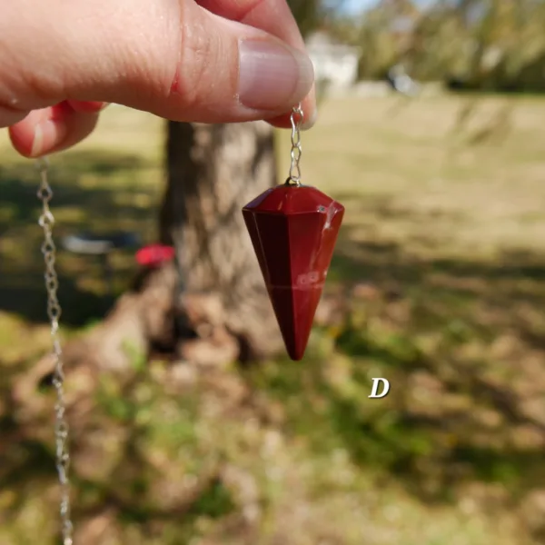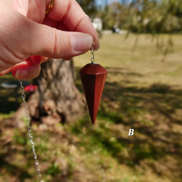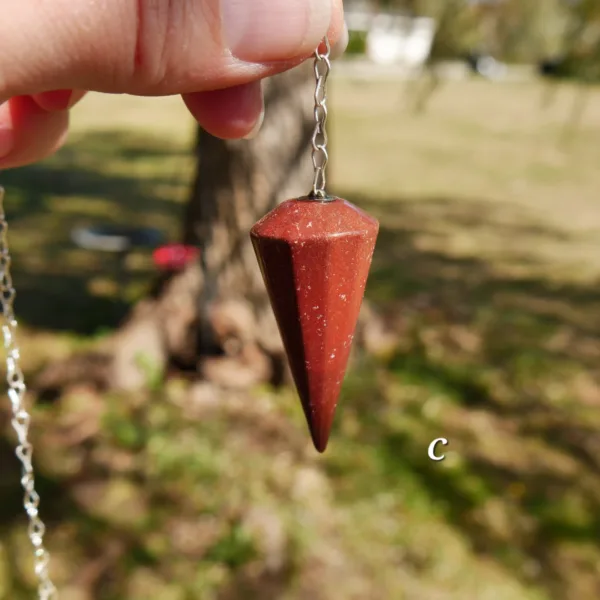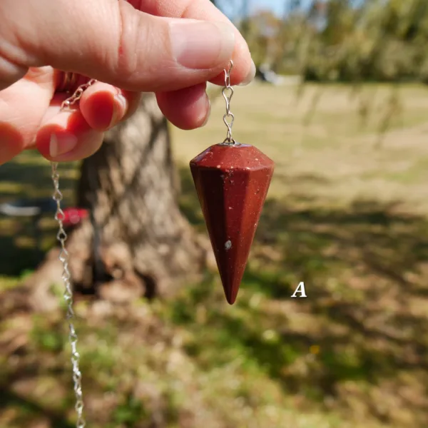 Pendulums are made from Red Jasper stone, mined and polished in Brazil. Each pendulum comes with an 8″ silver tone chain.