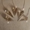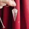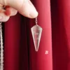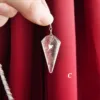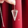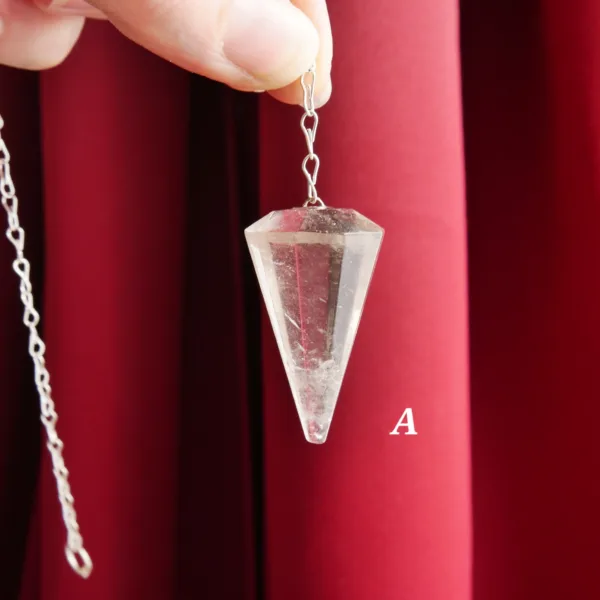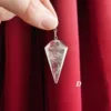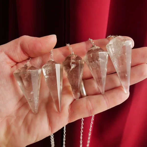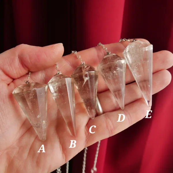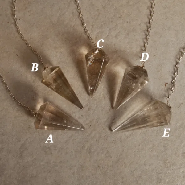 Pendulums are made from Natural Smoky Quartz. Average pendulum size is 1.5″, and comes with an 8″ silver tone chain.