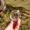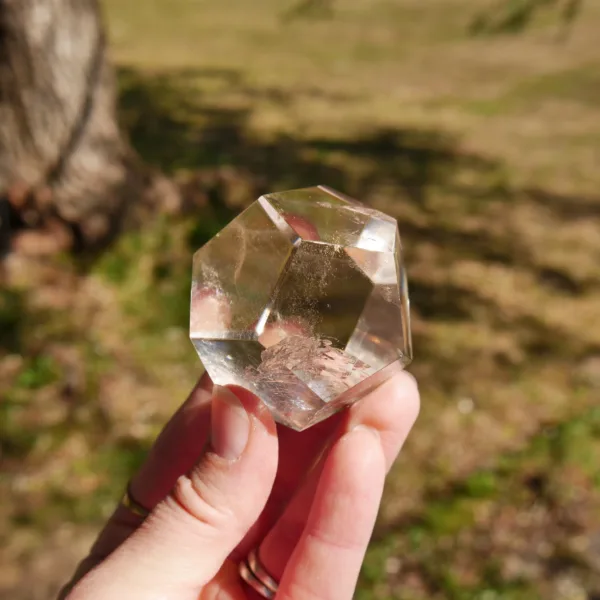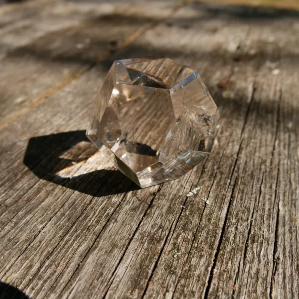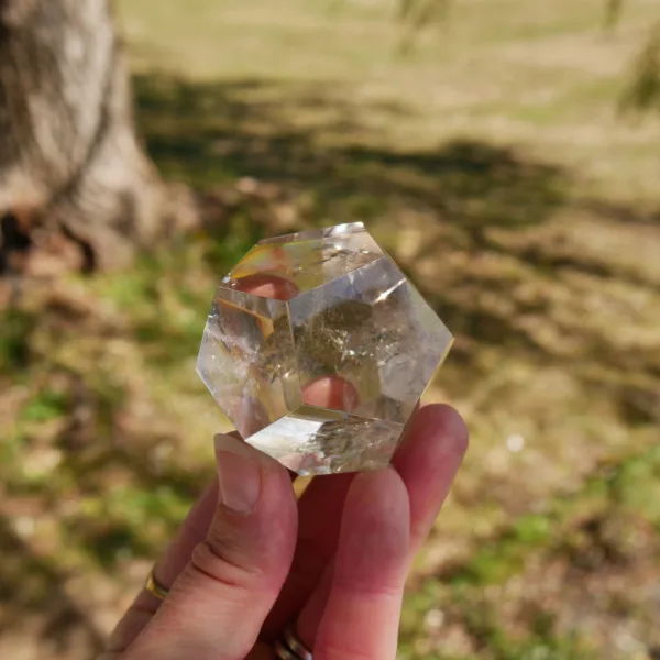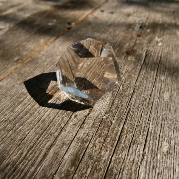 This piece is carved from high-quality Smoky Quartz. It displays water-like clarity, flashy rainbows, and a rich smoky color. This piece is expertly carved and polished. In the sunlight – it glows! Our sacred geometry shapes are hand-carved by talented Brazilian artisans. You will receive the exact piece pictured here.