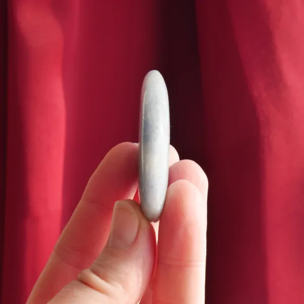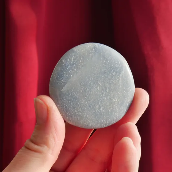 This subtly sparling Blue Aventurine palm stone is cut in an unusual disk-like shape. Intended for use as a palm stone, its low profile makes it a perfect carry stone as well. With a light blue color, lightly woven with veins of lighter blue, this stone is particularly soothing and pleasing to look at.