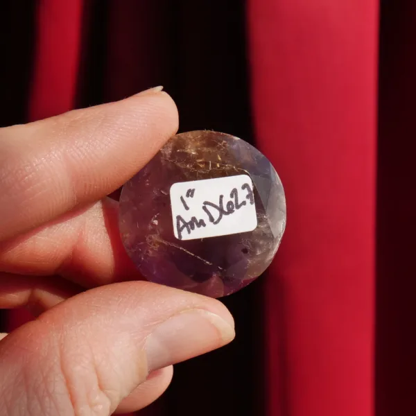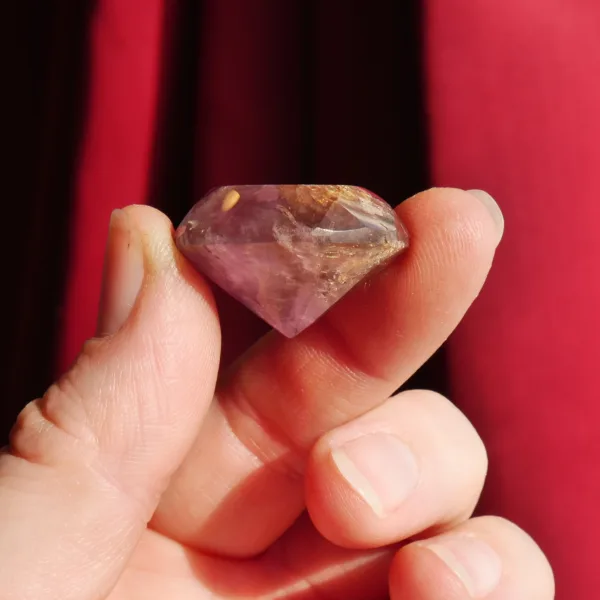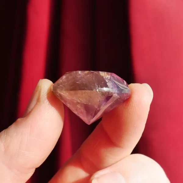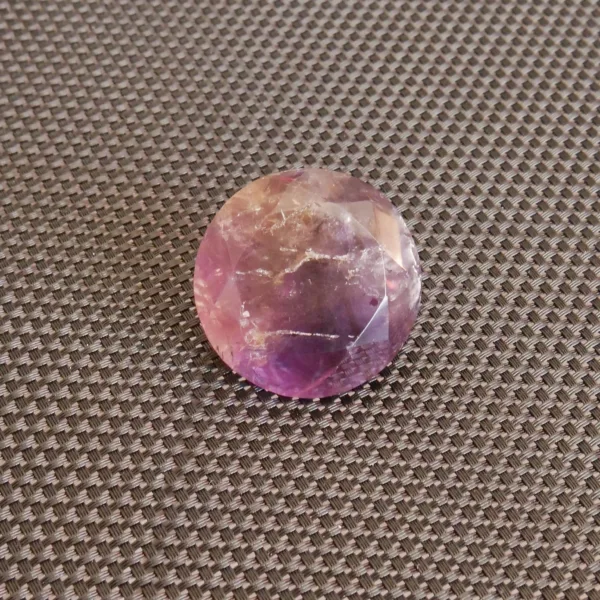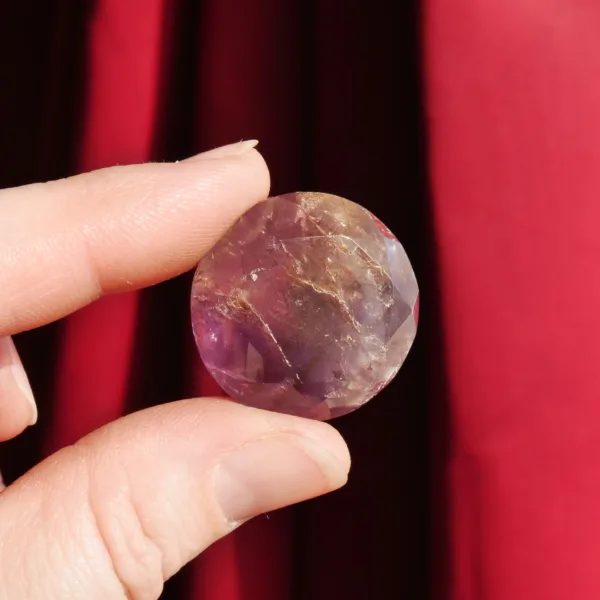 This Ametrine diamond features the highly sought after, naturally occurring mix of Amethyst and citrine. Deep purple amethyst complements the rich yellow tones of citrine, swirling together in a delightful symbiotic combination. Beautifully faceted, this gemstone catches the light beautifully! This piece is perfect for displays, or custom jewelry where are large, faceted gem is desired. This crystal diamond measures 0.8″ in diameter. Total weight is 39 Carats. Mined and polished in Brazil.