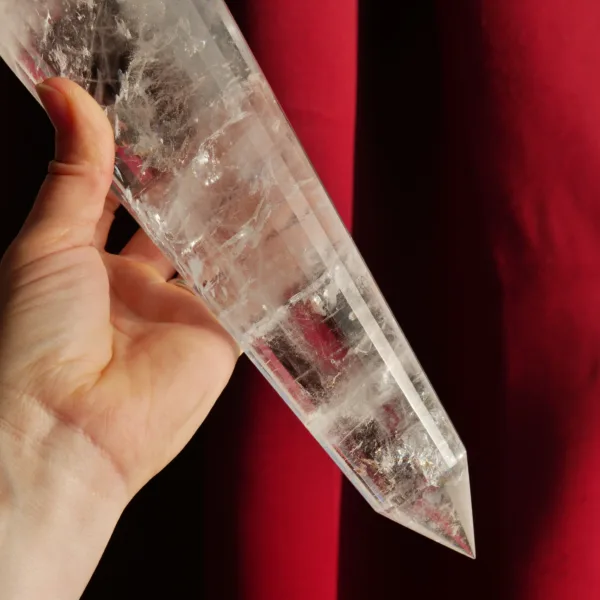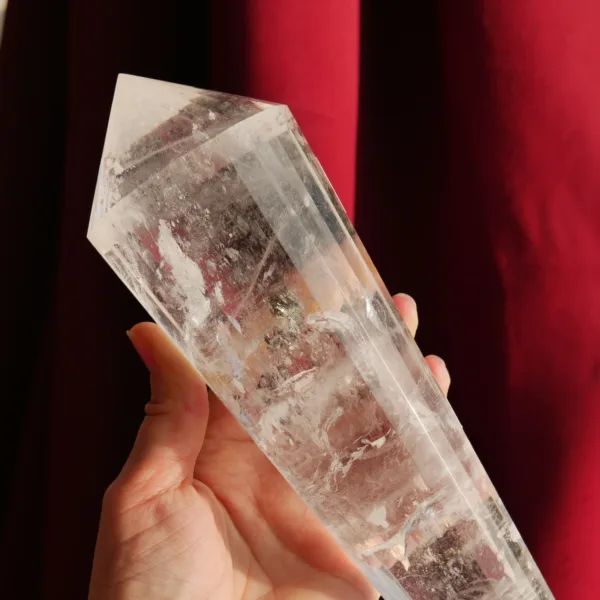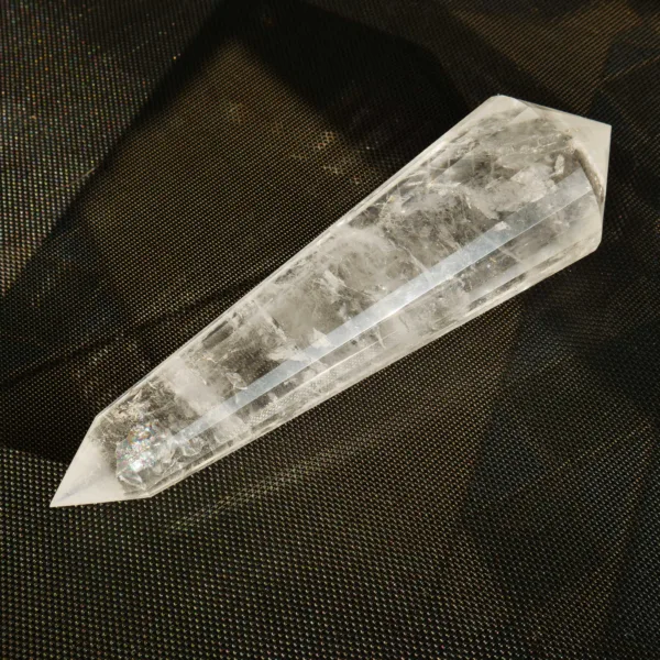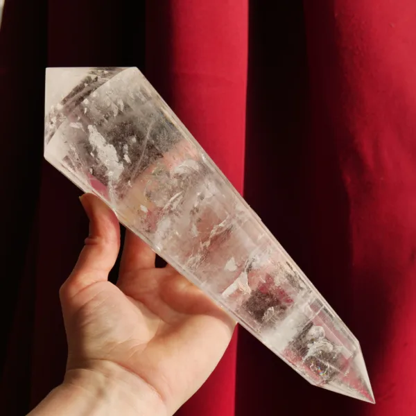 This beautiful high quality Clear Quartz Vogel features sparkling clarity, with large flashy rainbows within. This piece has been cut with 24 facets around the outside, which not only increases the brilliance of the Vogel, but is said to create increased energy production and a Vogel suitable for use in transformation efforts. Additionally – this piece is a “singer”. When gently tapped at the tip, it resonates with a soft chime. This phenomenon is only observed in crystals in which the molecules align perfectly to create this resonance. This Vogel weighs 3 Lb 1.2 oz and measures 10″ long. Made from Clear Quartz, mined and polished in Brazil. The transmitting end (smaller) is 58° and the internal angle of the larger receiving end is 46°