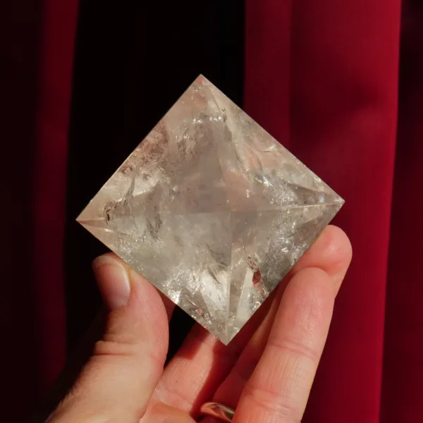 This beautiful piece is carved from high-quality clear quartz with sparkling clarity and flashy rainbows. Our sacred geometry shapes are hand-carved by talented Brazilian artisans. You will receive the exact piece pictured here.