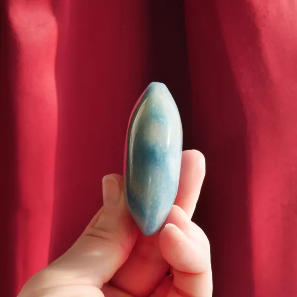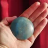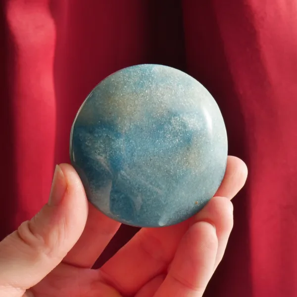 This blue-swirl Trolleite palm stone is cut in an unusual disk-like shape. Intended for use as a palm stone, its low profile makes it a lovely carry stone as well. With a mottled blue color which ranges from nearly white to sky blue, and a light sprinkle of glittery inclusions, this piece is particularly interesting to look at, and fits perfectly in the palm.