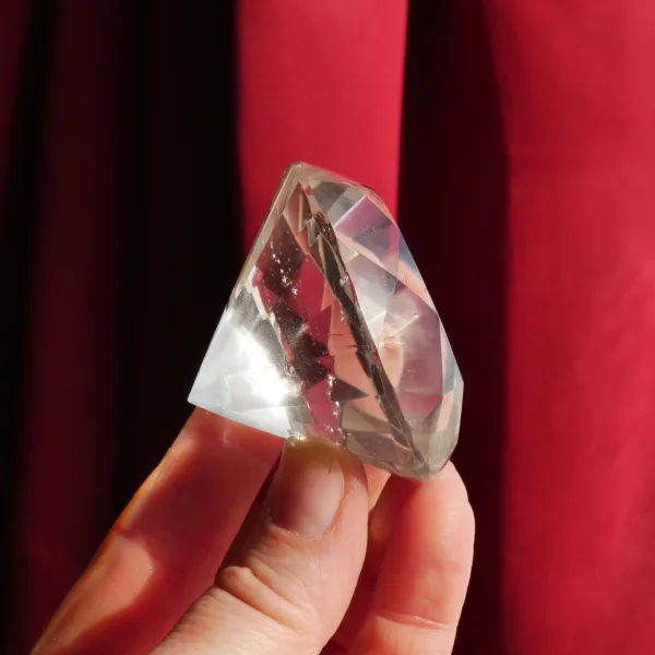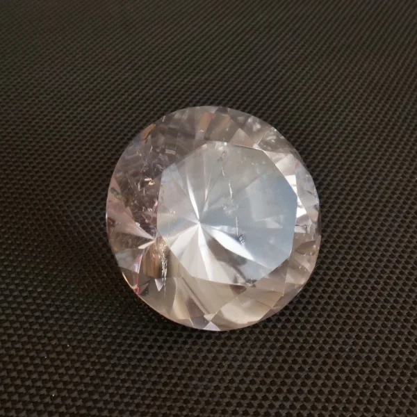 This Quartz diamond has been expertly faceted in Brazil. It features sparkling clarity, and flashes beautifully when it catches the light! A larger gemstone, this piece is best suited for display. It will be a dazzling addition and a centerpiece to any collection! This crystal diamond measures 2.2″ in diameter. Total weight is 586 Carats. Made from Clear Quartz, mined and polished in Brazil.