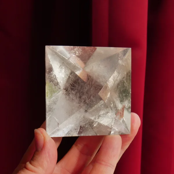 This beautiful piece is carved from high-quality clear quartz with sparkling clarity and flashy rainbows. Our sacred geometry shapes are hand-carved by talented Brazilian artisans. You will receive the exact piece pictured here.
