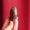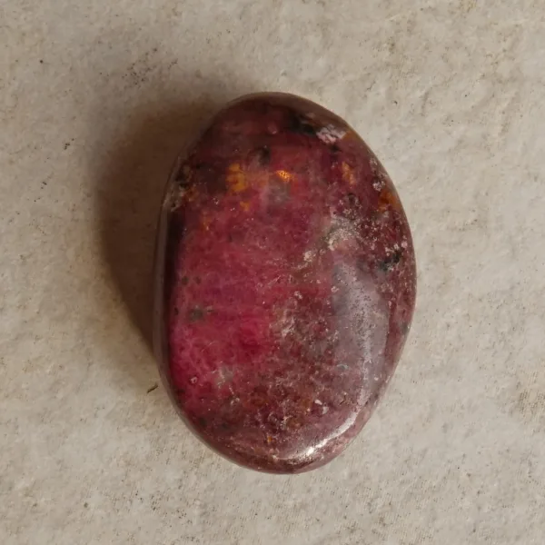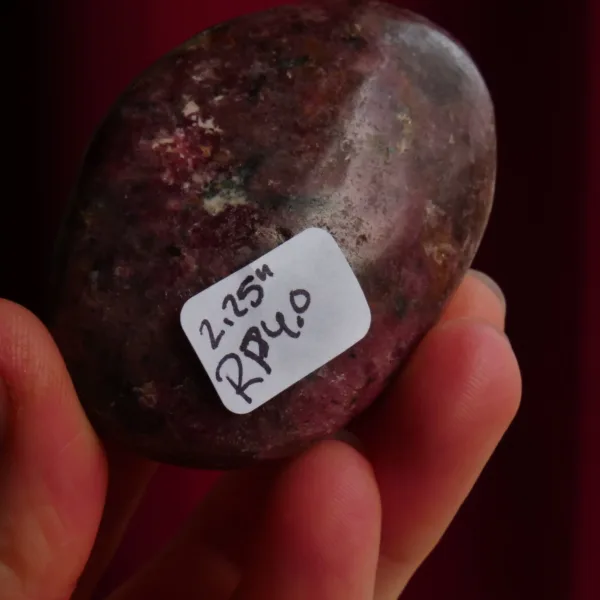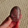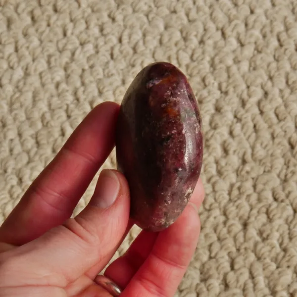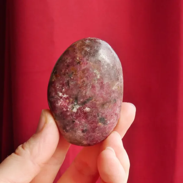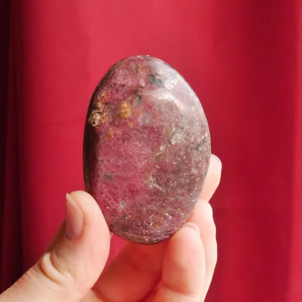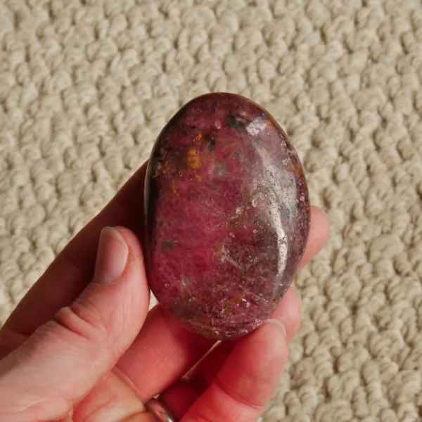 This palm stone features a lovely soft pink color, with small inclusions of black manganese oxide. The name “rhodonite” is derived from the Greek word for rose. It resonates with the heart chakra and is often considered the stone of love and symbolizes grace and elegance. Measures 2.25″ and weighs 4 oz