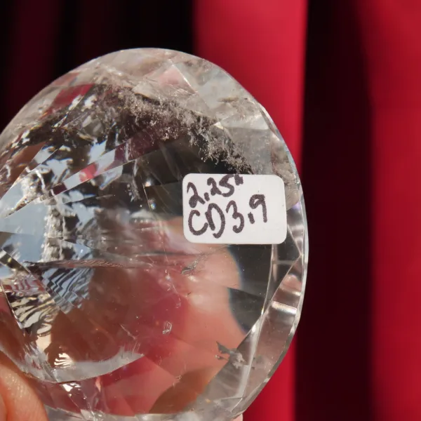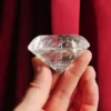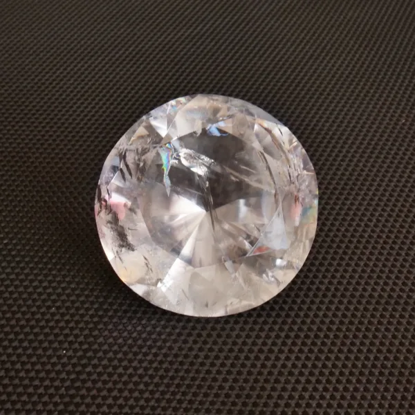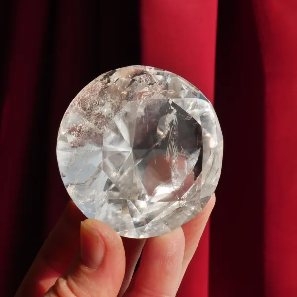 This Quartz diamond has been expertly faceted in Brazil. It features sparkling clarity and flashes beautifully when it catches the light! A larger gemstone, this piece is best suited for display. It will be a dazzling addition and a centerpiece to any collection! This crystal diamond measures 2.25″ in diameter. Total weight is 556 Carats. Made from Clear Quartz, mined and polished in Brazil.