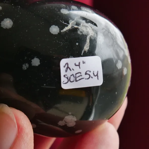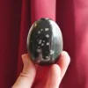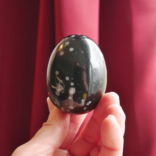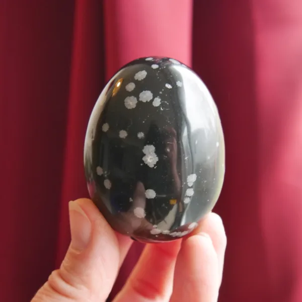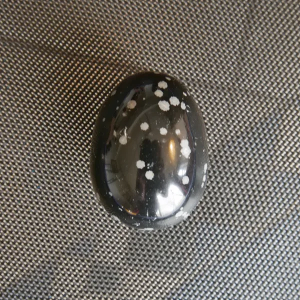 This glossy egg features jet black obsidian with splashes of white “snowflakes” which create a visual treat. Obsidian is a volcanic glass, and the snowflake pattern is caused by deposits of Cristobalite, a polymorph of silica (quartz) which only forms at very high temperatures. This egg measures 2.4″ tall, and weighs 5.4 oz. From South Africa