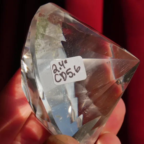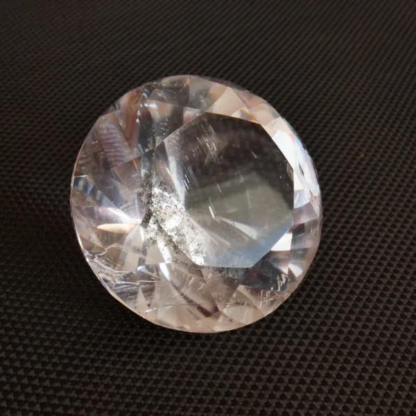 This Quartz diamond has been expertly faceted in Brazil. It features sparkling clarity, chlorite inclusions, and flashes beautifully when it catches the light! A larger gemstone, this piece is best suited for display. It will be a dazzling addition and a centerpiece to any collection! This crystal diamond measures 2.4″ in diameter. Total weight is 785 Carats. Made from Clear Quartz, mined and polished in Brazil.