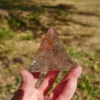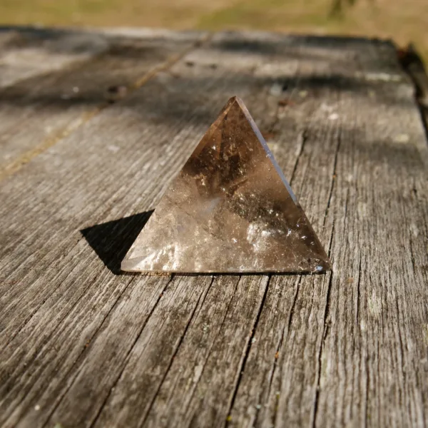 This beautiful Smoky Quartz tetrahedron features sparkling clarity and flashy rainbows within. Expertly polished with flawless points, this piece glows in the light! Tetrahedron crystals have the best optical effects – when held at the correct angle, the internal reflection of light gives an “eternal” repeating illusion. Our platonic solids are carved by hand in Brazil by talented artisans. I am always impressed with their work. This piece measures 2.5″ along each side and weighs 3.3 Oz. Made from Natural Smoky Quartz, mined and polished in Brazil.