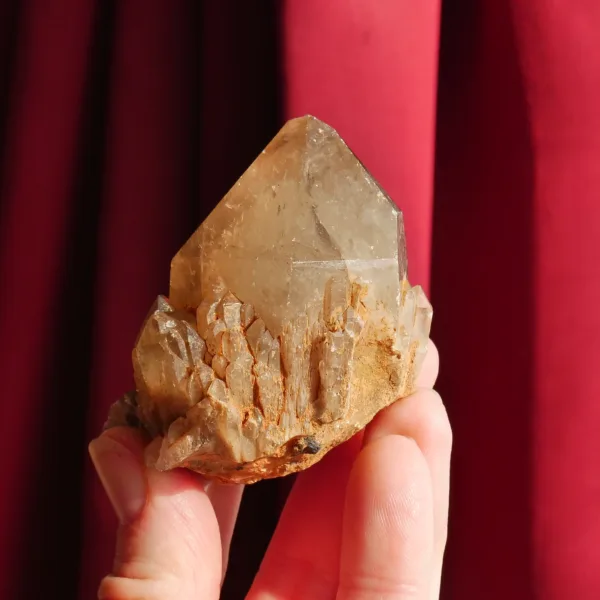 This sparkling Citrine cluster from the Congo exhibits a lovely large group of cascading points, in the classic Kundalini (artichoke/pineapple-like formation) from this region. This piece presents rich coloring and has a phantom within the main point. Kundalini Citrine is renowned amongst collectors and healers alike; it is sought after for the color, which is becoming hard to find, and the trademark Kundalini formation which is unlike anywhere else in the world. This piece will become an asset to any collection. This cluster measures 2.5″ and weighs 5.4 oz