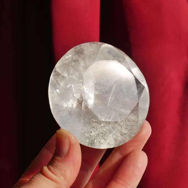 This Quartz diamond has been expertly faceted in Brazil. It features sparkling clarity, and flashes beautifully when it catches the light! A larger gemstone, this piece is best suited for display. It will be a dazzling addition and a centerpiece to any collection! This crystal diamond measures 2.5″ in diameter. Total weight is 822 Carats. Made from Clear Quartz, mined and polished in Brazil.