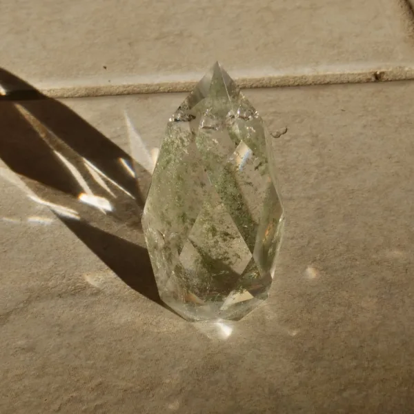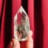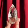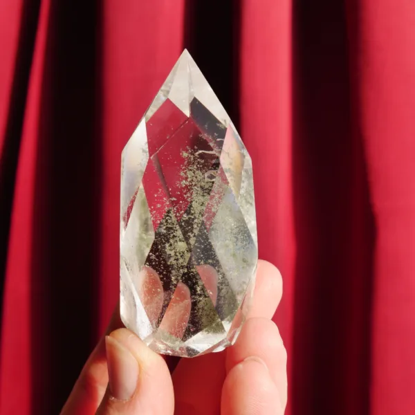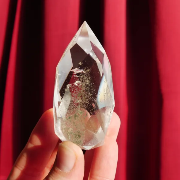 This beautiful clear quartz flame is a stunner. With sparkling clarity and large facets that reflect light from any angle, this piece features chlorite inclusions delicately suspended within the center. This piece is a ray of light and will be a stunning addition to any collection! Crafted from clear garden quartz mined and polished in Brazil. This piece weighs 3.4 oz and stands 2.6″ tall