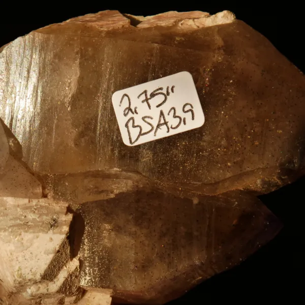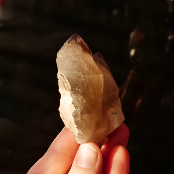 These tantric-twin points feature a deep smoky and amethyst-tipped coloring, phantoms within the terminations, and glittery flecks of hematite inclusions throughout the entire piece. This small cabinet size specimen measures 2.75″ at its largest dimension, and weighs 3.9 oz. From the Brandberg Massif in Namibia, Africa. Please see photos for full details – you will receive the exact specimen shown here.