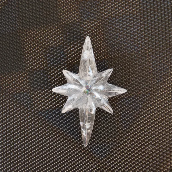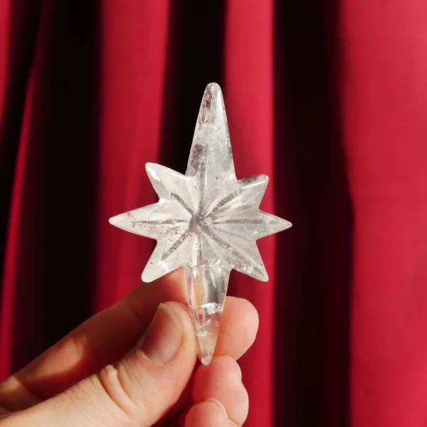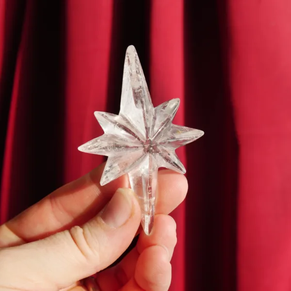 Happy Holidays from Drusy Dreams! This stunning Christmas star was carved exclusively for our shop, custom made by talented carvers in Brazil. The quartz is of the highest quality – glittering clarity with just the right amount of rainbows suspended within. This festive star will be a focal point in any collection, at any time of year. Hold it to the sunlight and it glows! This piece is 2.75″ at its largest dimension. **PLEASE NOTE* – unlike our other pieces, this star has a flat back and is designed to lay flat. All others are carved on both sides. See video*