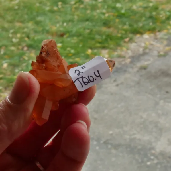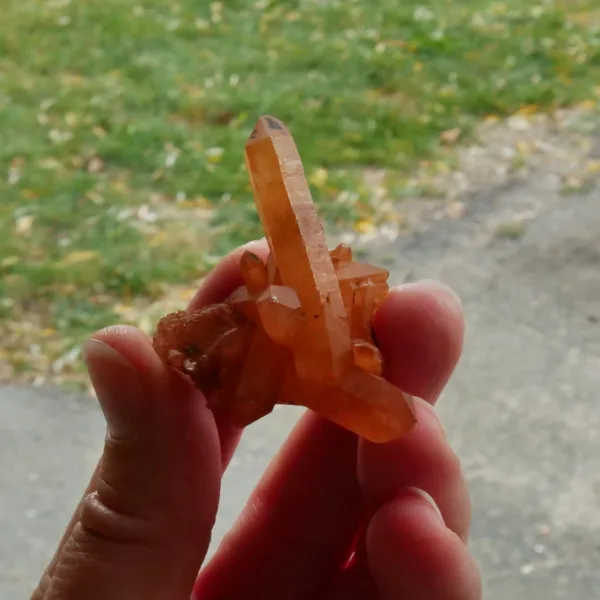 Tangerine Quartz, also known as Hematite or Ferruginous quartz, is quartz that has been coated or included with a layer of hematite, or iron oxide. The bright orange color seen in these pieces is highly sought after among collectors. Our tangerine quartz pieces are carefully selected from Brazil, and will be a bright addition to any collection. Please see the pictures – you will see the exact piece shown here.