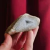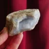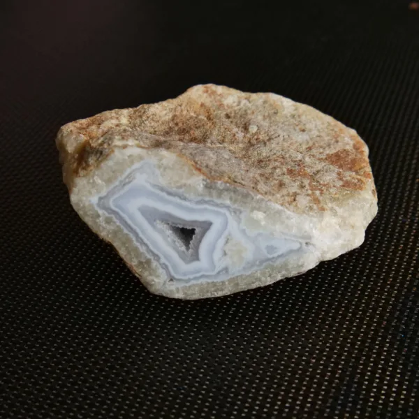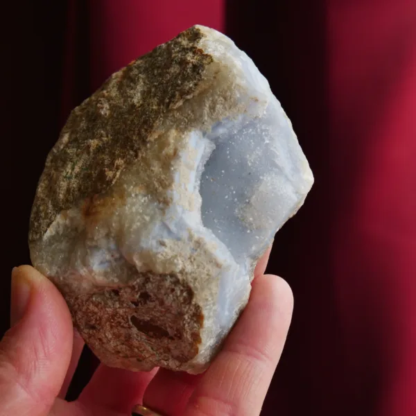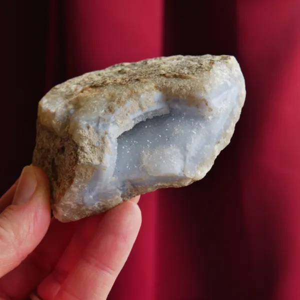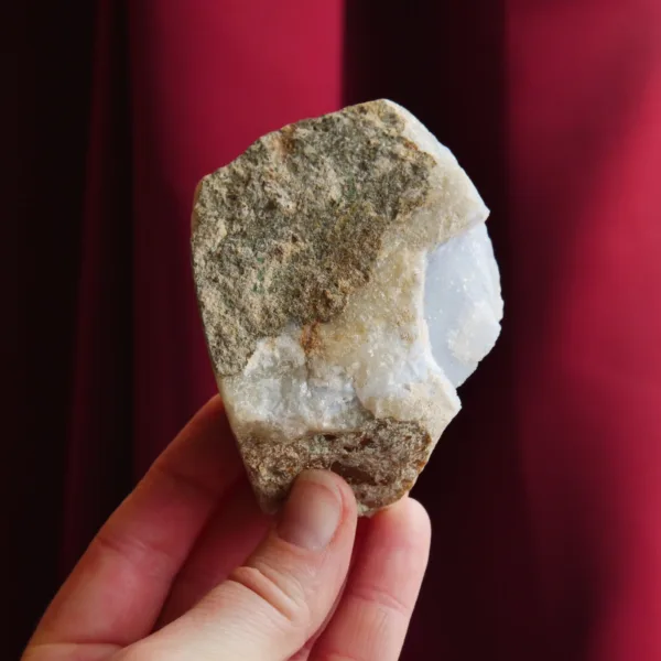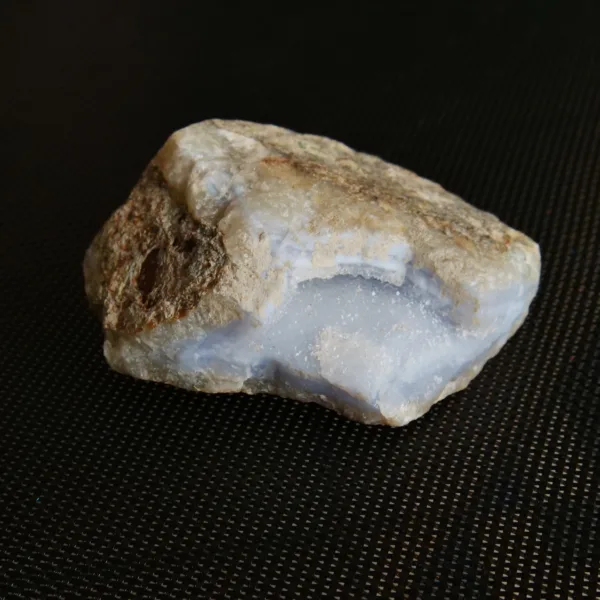 This piece features sparkling drusy pockets on two faces, is filled with white and blue banding, and coated in microcrystalline sparkle. Blue Lace agate is a variety of Chalcedony. It features a distinct soft blue color, delicate banding, and sparkling crystal pockets. Every surface sparkles in the light, due to the micro-crystalline nature of this material. These beautiful crystals are true African gems! This Namibian material tends to form in thinner plates, rather than the hollow geodes seen out of Malawi. While blue lace agate itself is not especially rare, this Namibian material is. This piece weighs 7.4 oz and measures 3.25″ at it’s largest dimension.