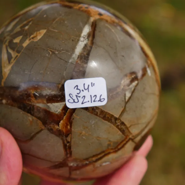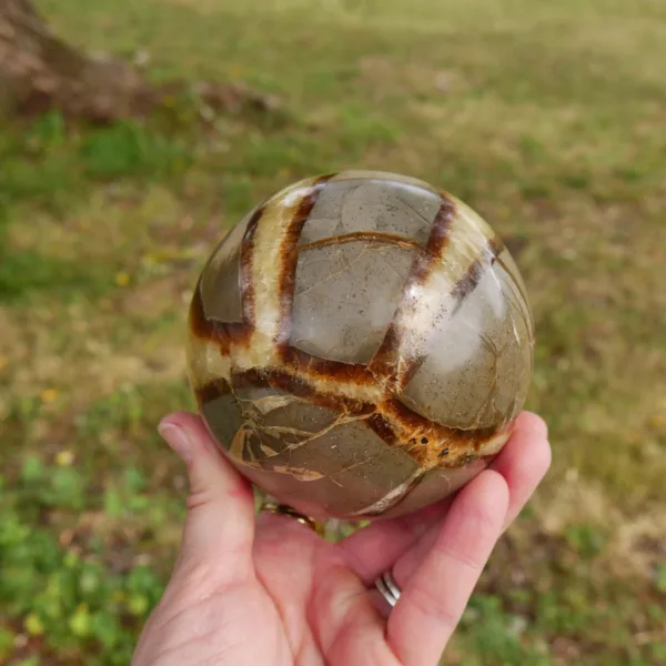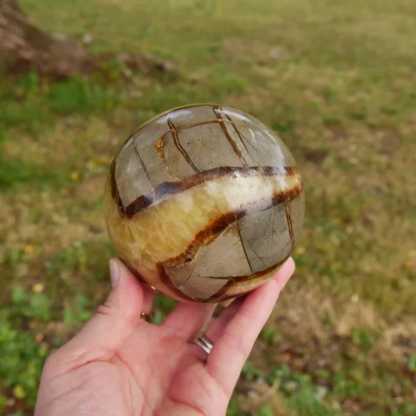 This large sphere features beautiful sections of yellow calcite trimmed with dark amber outlines, and a small drusy cave lined with fully terminated calcite crystals. Septarian stone, also known as Septerye and Dragon Stone, is a concretion created from multiple minerals. The sandy colored sections are Limestone, the host stone. Over time cracks in the stone are filled with calcium, which crystalizes into Aragonite and Calcite in distinct brown and yellow bands.
