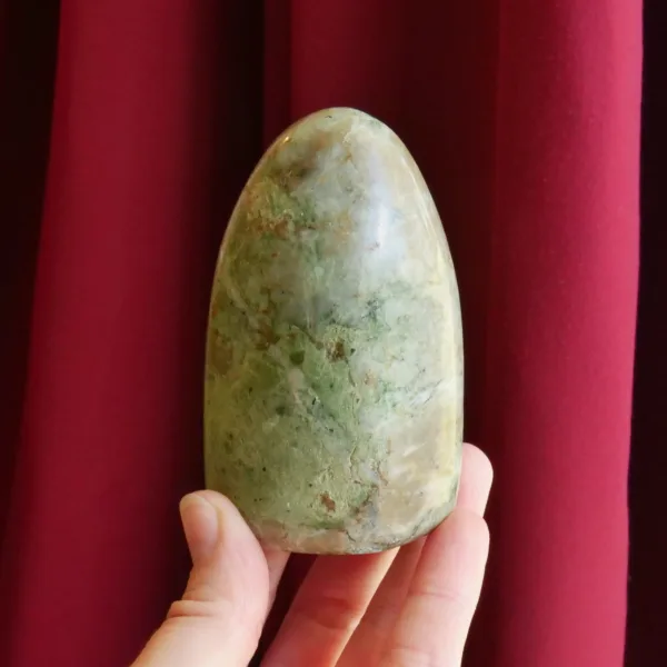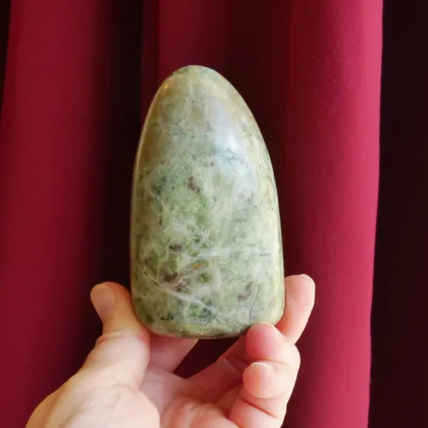 Chrysoprase is a lovely apple-green stone, and a fairly uncommon variety of chalcedony which gets its color from the presence of nickel. It is popularly used in jewelry and for tumbling or carving, due to its strength and beautiful color. This lovely standing freeform exhibits that beautiful color, as well as some rivulets of inclusions funning throughout. Measures 3.5″ tall and weighs 12.2 oz. From Madagascar.