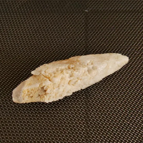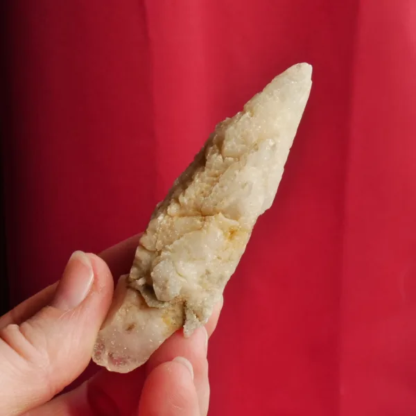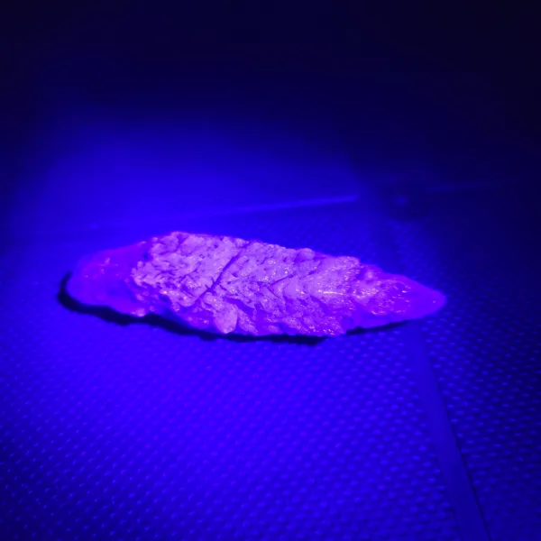 These dogtooth calcite spears are a unique anomaly found only in Lesotho, Africa. Presenting layers of calcite interspersed with drusy quartz, this near-pseudomorph conglomerate is a fascinating formation. Glowing pink under UV light, these funky points are a standout, and a unique addition to any collection. This small cabinet sized specimen measures 3.5″ in length and weighs 1.6 oz. From Lesotho, Africa: these pieces were mined by a man named Albert at his favorite mountain for crystal hunting (hence the name). Please see the pictures for full details – you will receive the exact piece shown here.