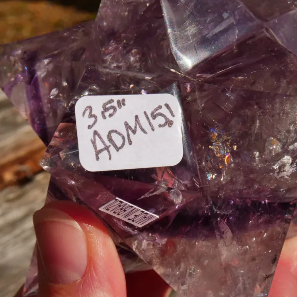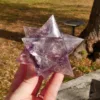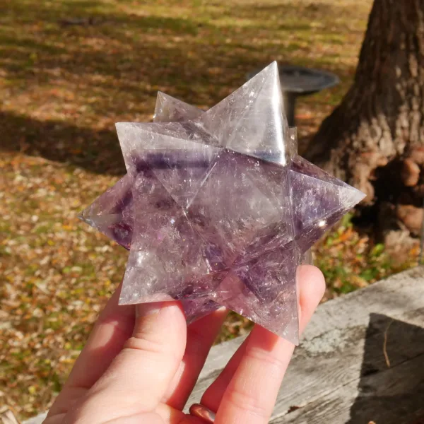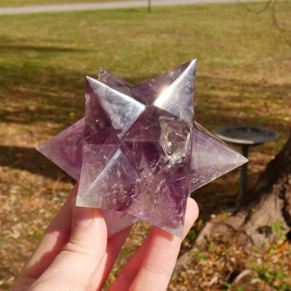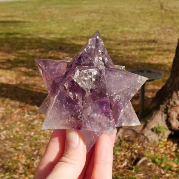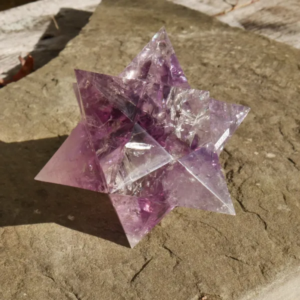 This beautiful Chevron Amethyst Double Merkaba (or “dodecahedral merkaba”) is stunning. It features high clarity and bands of rich purple coloring. In the light, it absolutely glows! This piece has been masterfully carved and polished, and will be a highlight in any collection. This piece measures 3.5″ in all directions and weighs 15.1 Oz. Made from light Amethyst quartz mined and polished in Brazil.