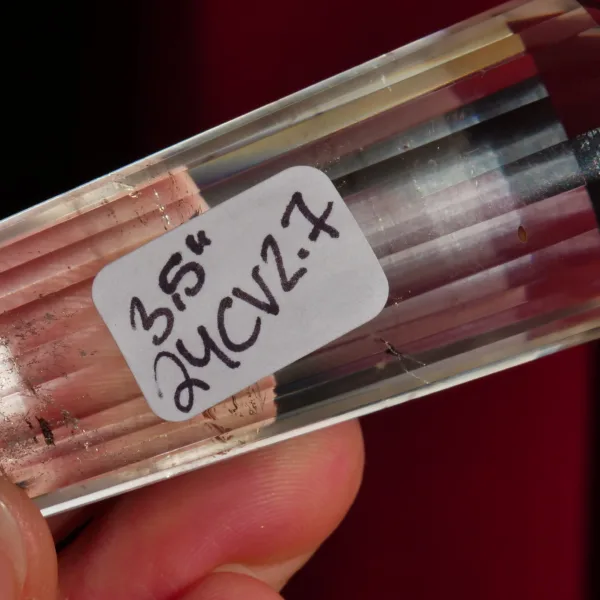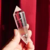 This beautiful high quality Clear Quartz Vogel features sparkling clarity, with large flashy rainbows within. This piece has been cut with 24 facets around the outside, which not only increases the brilliance of the Vogel, but also creates increased energy production and a Vogel suitable for use in transformation efforts. This Vogel weighs 2.7 oz and measures 3.5″ long. Made from Clear Quartz, mined and polished in Brazil. The transmitting end (smaller) is 55° and the internal angle of the larger receiving end is 53°