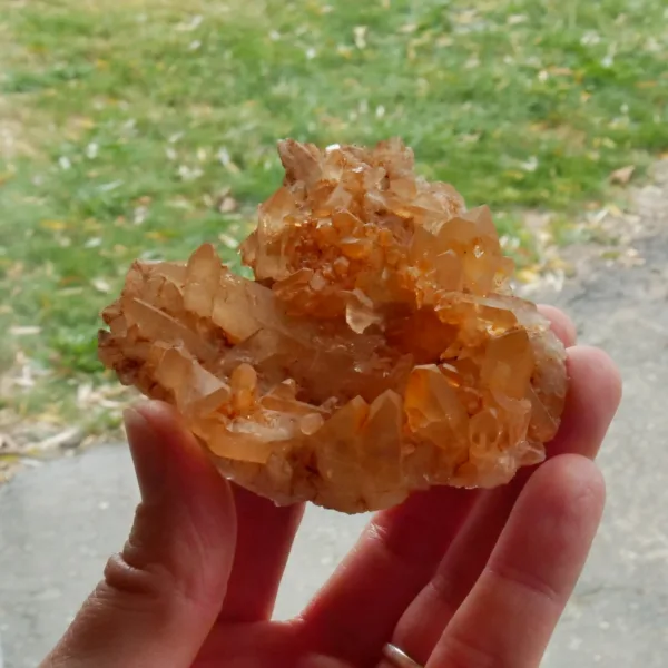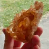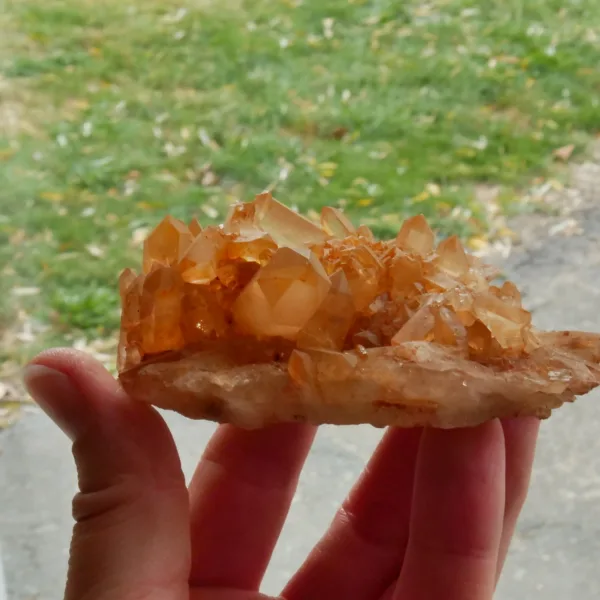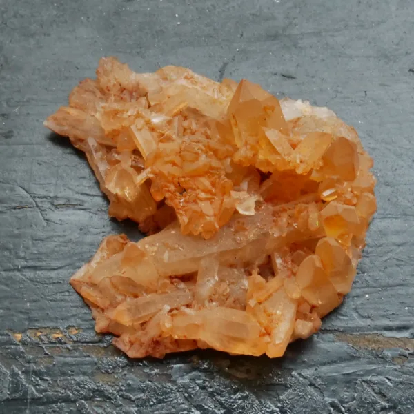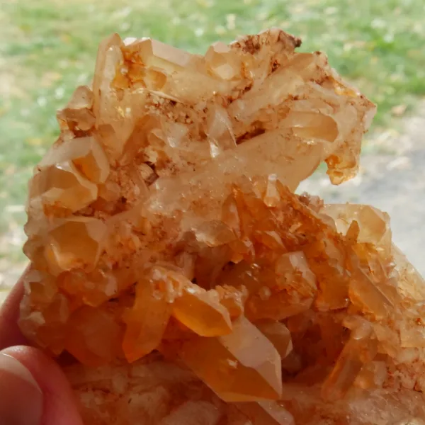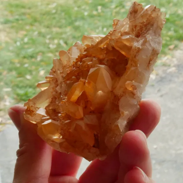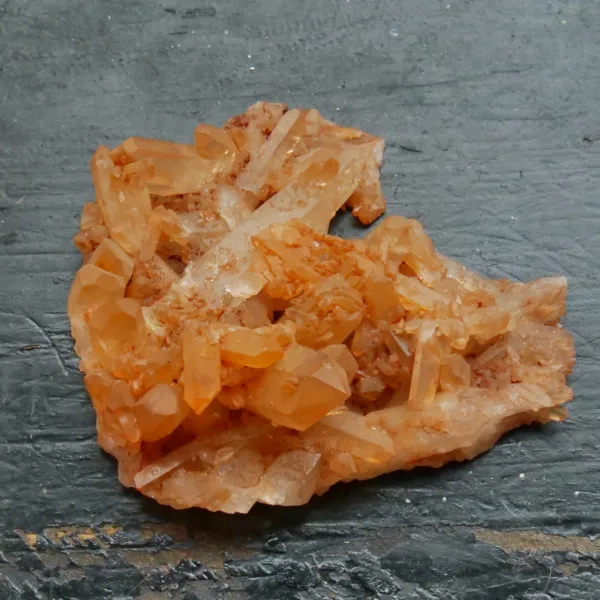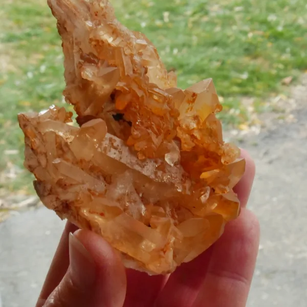Tangerine Quartz, also known as Hematite or Ferruginous quartz, is quartz that has been coated or included with a layer of hematite, or iron oxide. The bright orange color seen in these pieces is highly sought after among collectors. Our tangerine quartz pieces are carefully selected from Brazil, and will be a bright addition to any collection. Please see the pictures – you will see the exact piece shown here.