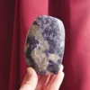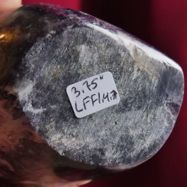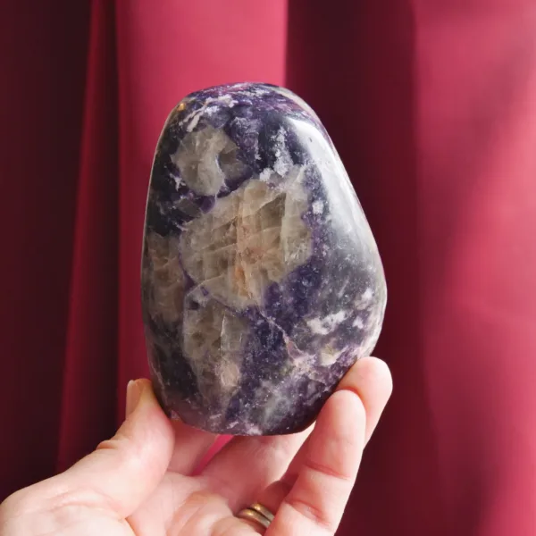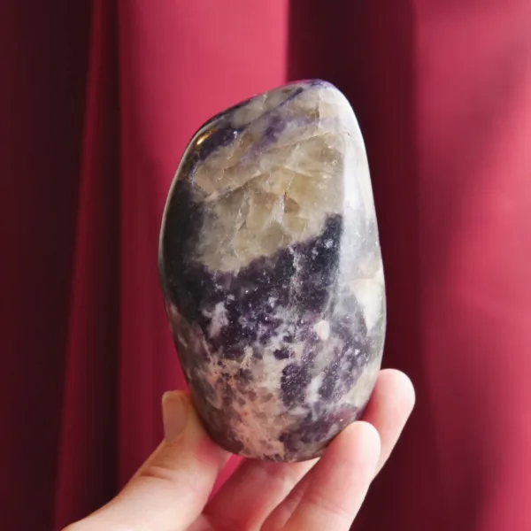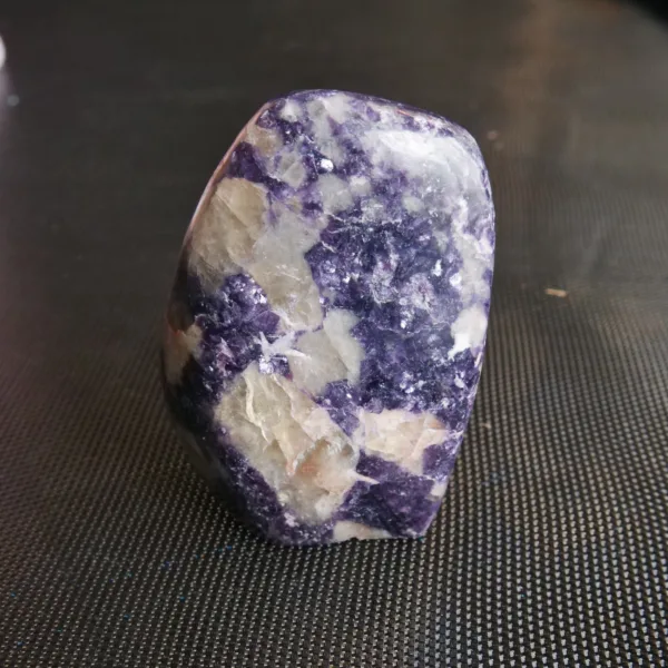 This glittering freeform features deep purple lepidolite, interspersed with large chunks of smoky quartz. The color of this large display piece is some of the richest I have encountered in this mineral, and when held to the sunlight it flashes brightly. Due to the varying hardness of the minerals within these pieces, this material can be quite difficult to polish. For best description, please see photos – you will receive the exact piece shown here. Weight is 1.3 Lbs and measures 3.75″ tall. From Ambatondrazaka, Madagascar