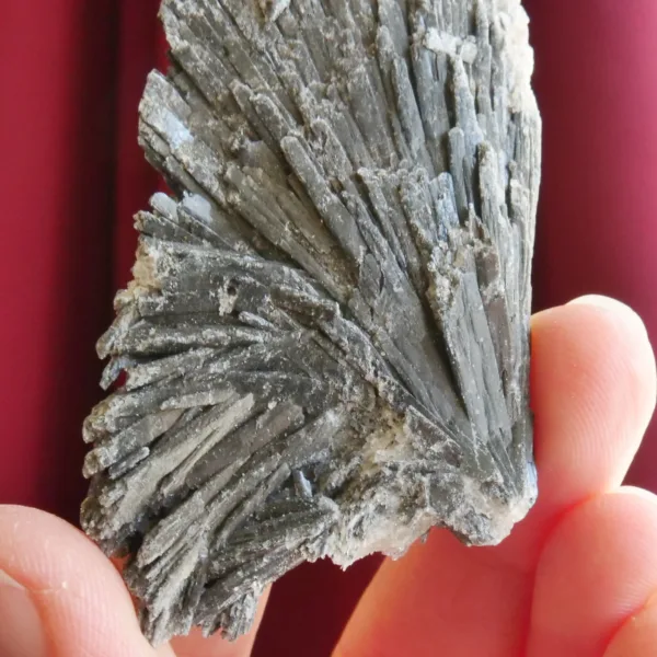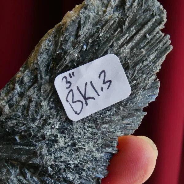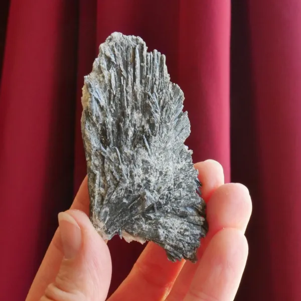 Black Kyanite, also known as “Witches Broom” is a variety of kyanite that forms in a signature fan-like spray of fine blades with a black color resulting from the presence of graphite. This specimen has formed into one large spray, with a beautiful chatoyancy that shimmers in the light. No mineral collection is complete without this staple mineral. This specimen weighs 1.3 oz and measures 3″ long. From Brazil.