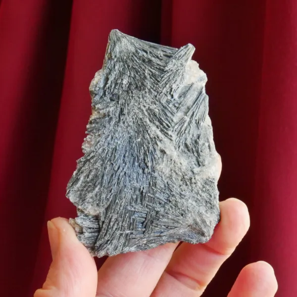 Black Kyanite, also known as “Witches Broom” is a variety of kyanite that forms in a signature fan-like spray of fine blades with a black color resulting from the presence of graphite. This specimen has formed into one large spray, with a beautiful chatoyancy that shimmers in the light. No mineral collection is complete without this staple mineral. This specimen weighs 2.8 oz and measures 3″ long. From Brazil.