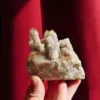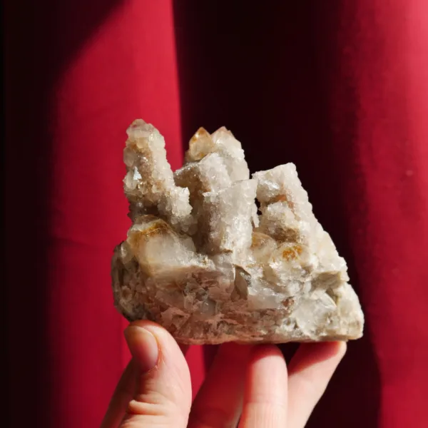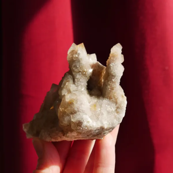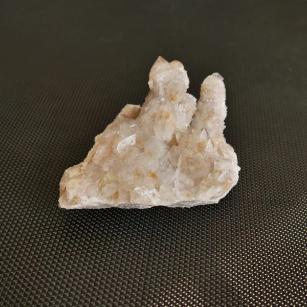 This sparkling Spirit Quartz cluster is a stunning display of drusy encrusted points. While Spirit Quartz is typically seen on the market in Amethyst tones, these clusters feature beautiful golden tones from Limonite deposits. This small cabinet-sized specimen weighs 9.1 oz and measures 3″ at its largest dimension. From Boekenhouthoek, South Africa. For best description please see photos – you will receive the exact piece pictured here.