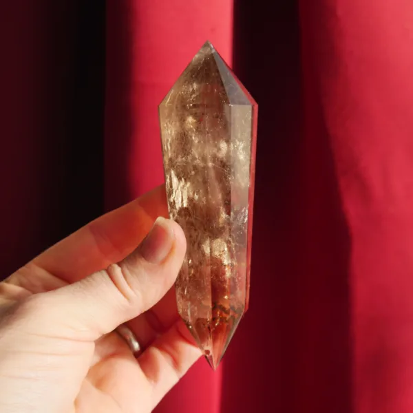 This beautiful Smoky Quartz Vogel features lovely natural coloring, and 12 flashy facets around the entire piece. Presenting some sparkling rainbows and beautiful clarity, this piece glows when held to the light. The amount of facets a Vogel contains influences the spin and intensity of the energy produced. 12-faceted pieces are perfect for general use. Weight of this piece is 5.4 oz and length is 4.25″. Made from Natural Smoky quartz, mined and polished in Brazil. The transmitting end (smaller) is 57° and the internal angle of the larger receiving end is 53°.