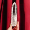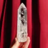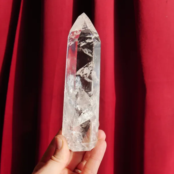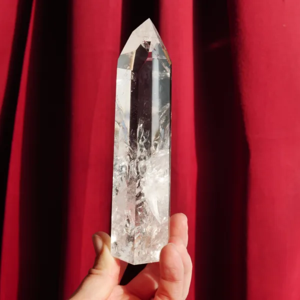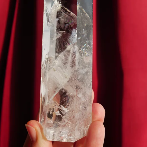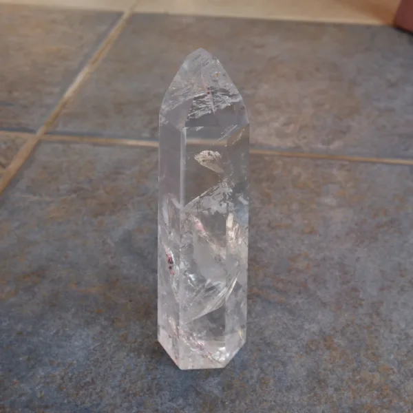 This tall quartz tower features remarkable clarity, flashy rainbow fractures, and best of all – a large penetrator near the center (also known as a bridge or inner child crystal). Penetrators are smaller crystals that grew into the body of the main crystal as it was forming, often against the grain of its growth pattern. This unique phenomenon creates a perfectly formed termination inside the main crystal. Similar to its growth and formation, these features carry an energy helpful for inner work, soul searching, and introspection, as well as connecting different aspects of oneself. This piece proudly stands 5.6″ tall and weighs 11.6 oz. Mined and polished in Brazil.