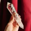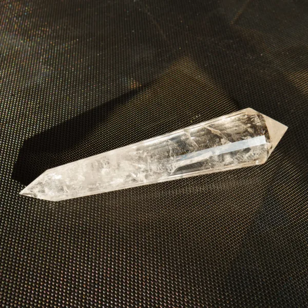 This beautiful high quality Clear Quartz Vogel features sparkling clarity, with large flashy rainbows within. This piece has been cut with 24 facets around the outside, which not only increases the brilliance of the Vogel, but is said to create increased energy production and a Vogel suitable for use in transformation efforts. Additionally – this piece is a “singer”. When gently tapped at the tip, it resonates with a soft chime. This phenomenon is only observed in crystals in which the molecules align perfectly to create this resonance. This Vogel weighs 10.9 oz and measures 7.25″ long. Made from Clear Quartz, mined and polished in Brazil. The transmitting end (smaller) is 54° and the internal angle of the larger receiving end is 52°