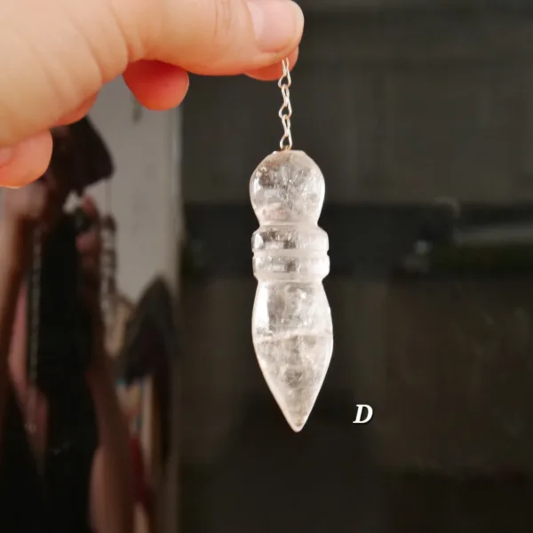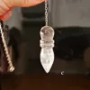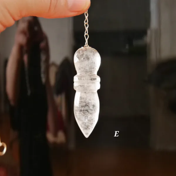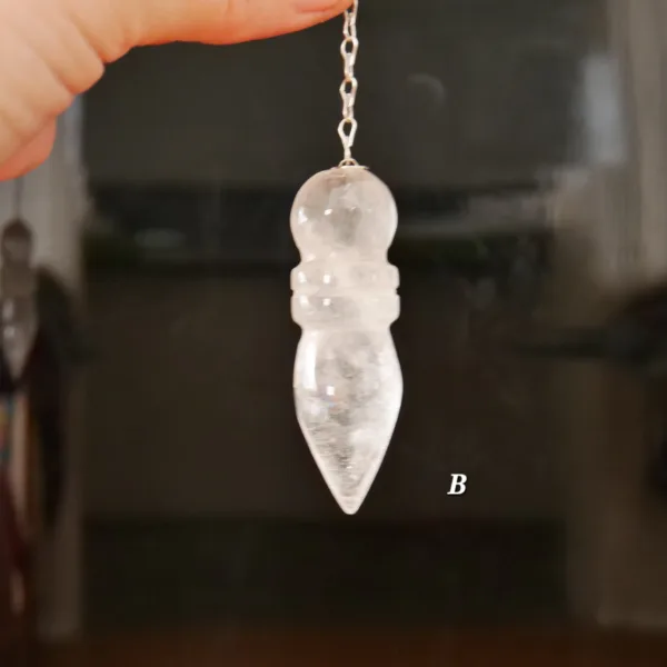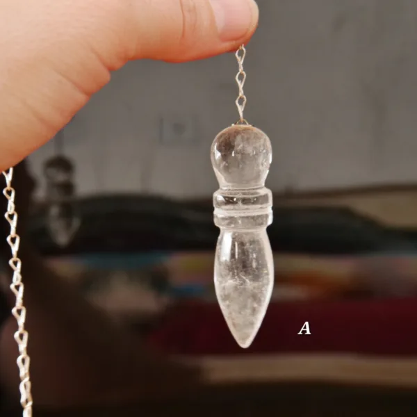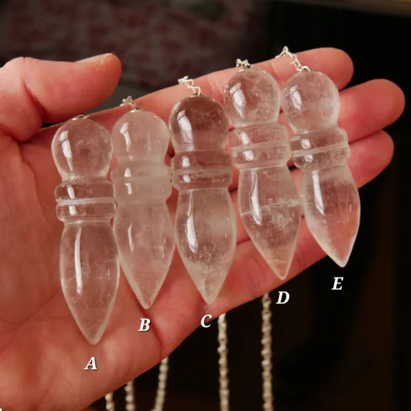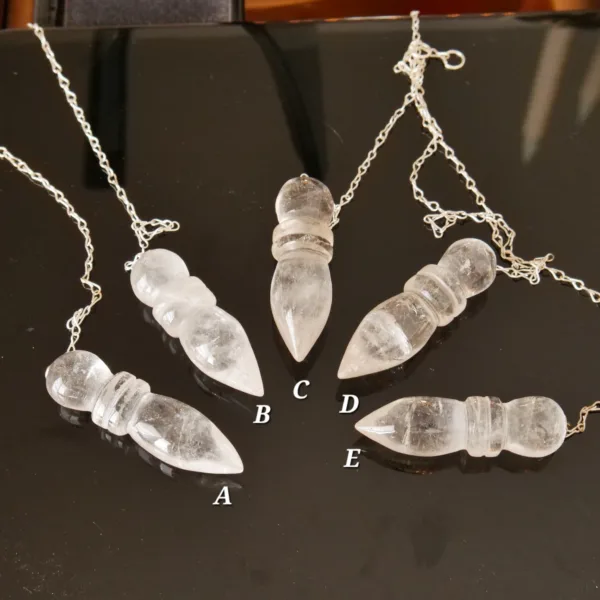These pendulums are made from Clear Quartz mined and polished in Brazil. Each pendulum crystal measures 2.25-2.5″ long with an 8″ silver tone chain.