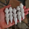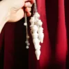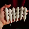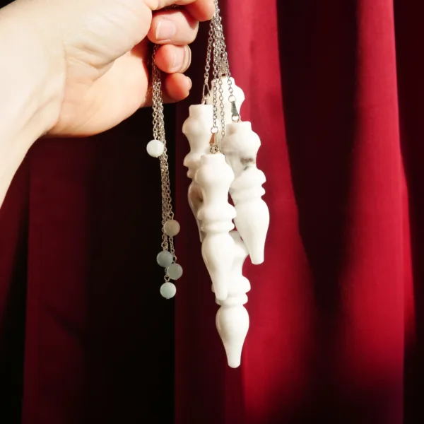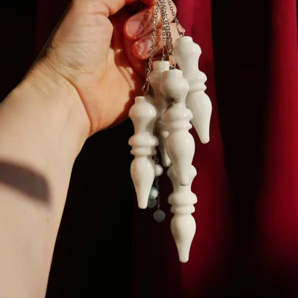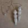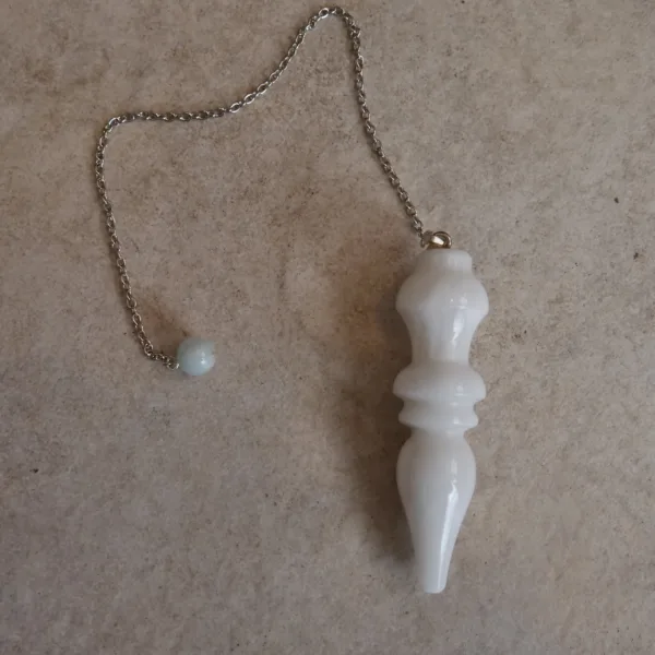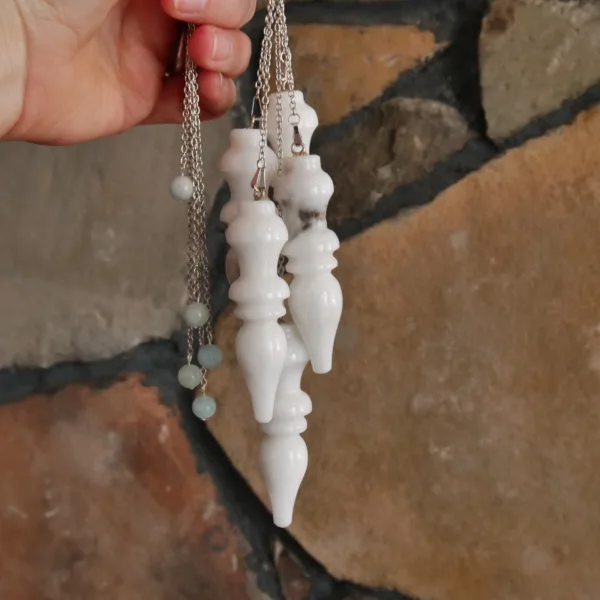 Custom made and designed for our shop, these pendulums are made of a stone known as White Jade in Pakistan, however to me it presents more as a White Quartz. The largest pendulums in our shop – each pendulum crystal measures about 2.75″ long, fitted with an 8″ silver tone chain and 6mm Aquamarine accent bead. Typically, I list pendulums so you can choose your own, but these are so similar (see pics) that I decided to list them as a quantity. If you would like to see exact available options, please message me. Otherwise, I will choose a pendulum for you.