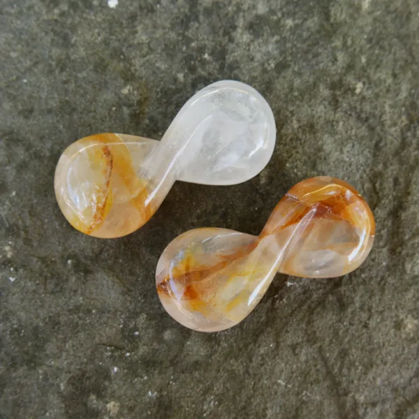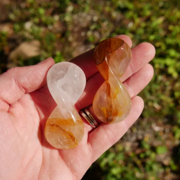 The infinity knot is a timeless design representing never ending love, unity, and commitment. These pieces are carved from Golden Healer crystal, which is Quartz with hematite inclusions woven throughout and resulting in a signature golden glow. Measuring approximately 2.25 x .75″, these are perfect as a carry stone, or as an addition to a shelf or alter display.