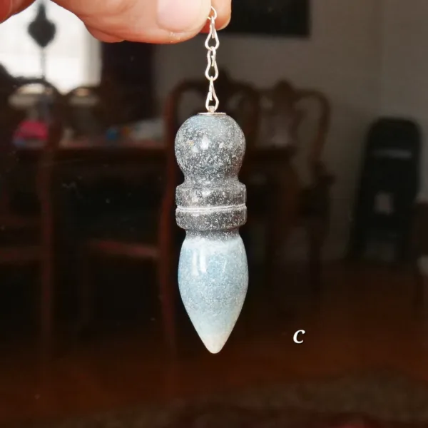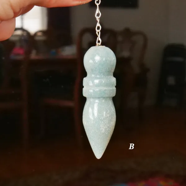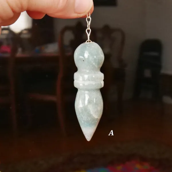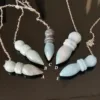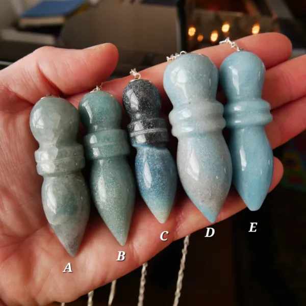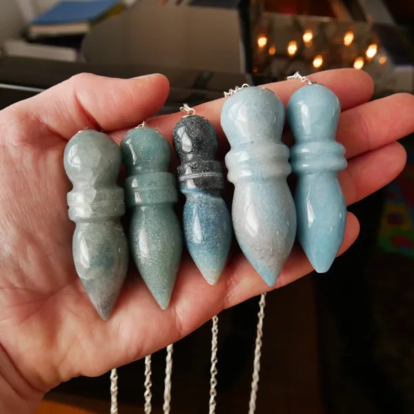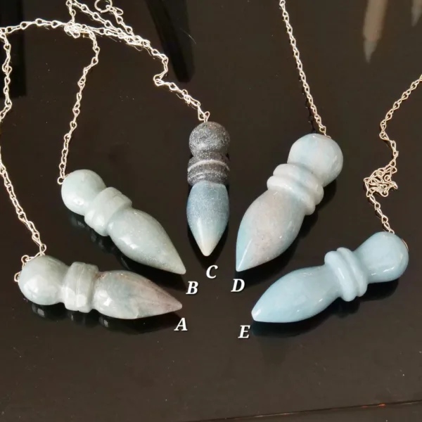 These pendulums are made from Trolleite mined and polished in Brazil. Each pendulum crystal measures 2.25-2.5″ long with an 8″ silver tone chain. They feature lovely blue color, varying from very light to a dark blue-gray.