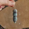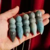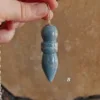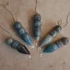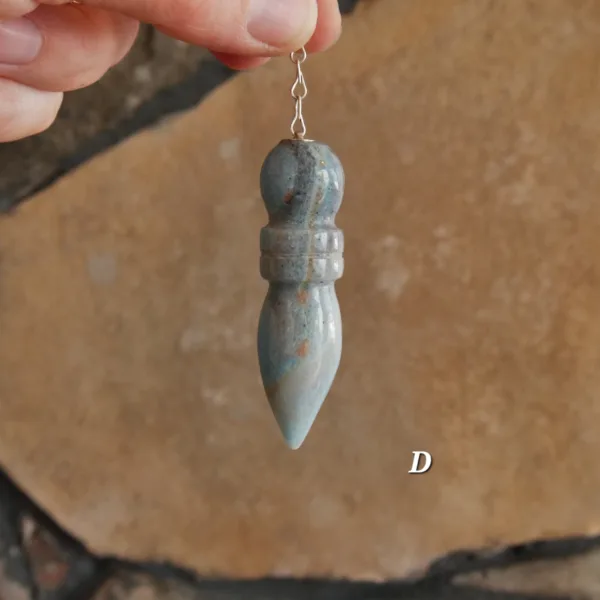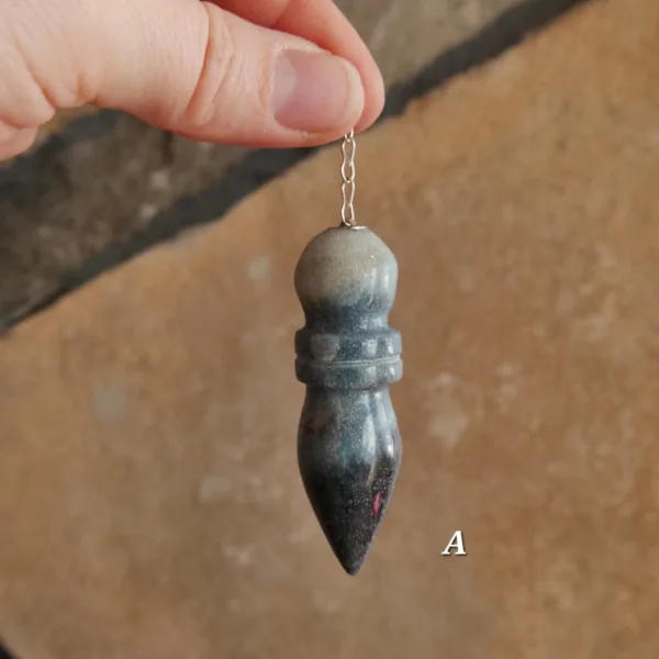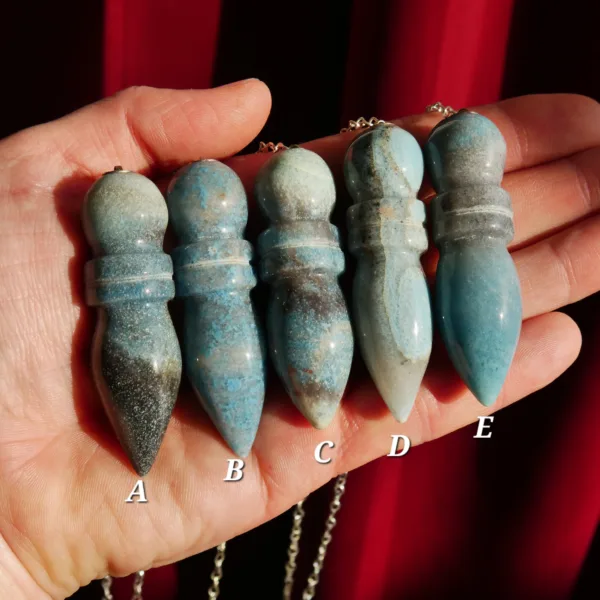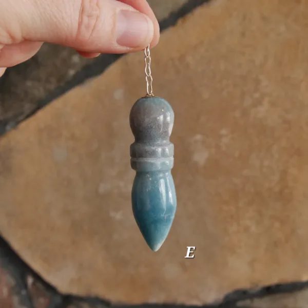 These pendulums are made from Trolleite mined and polished in Brazil. Each pendulum crystal measures 2.25-2.5″ long with an 8″ silver tone chain. They feature lovely blue color, varying from very light to a dark blue-gray.