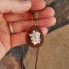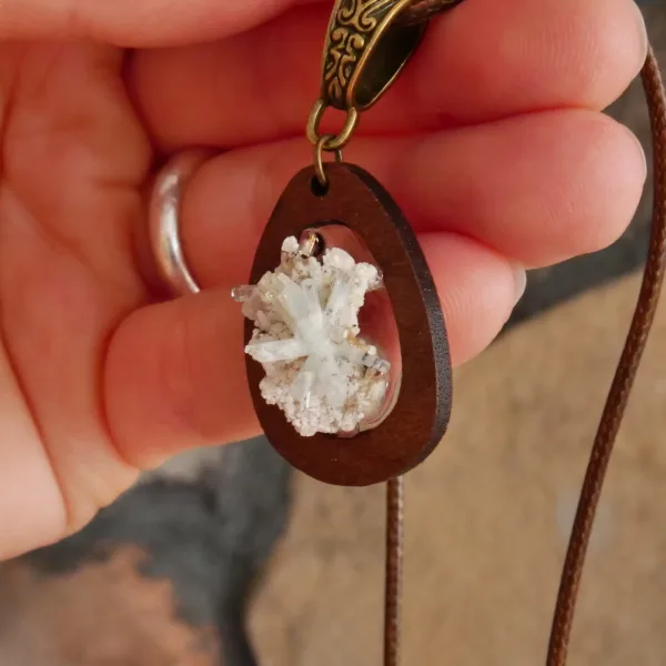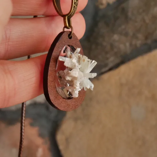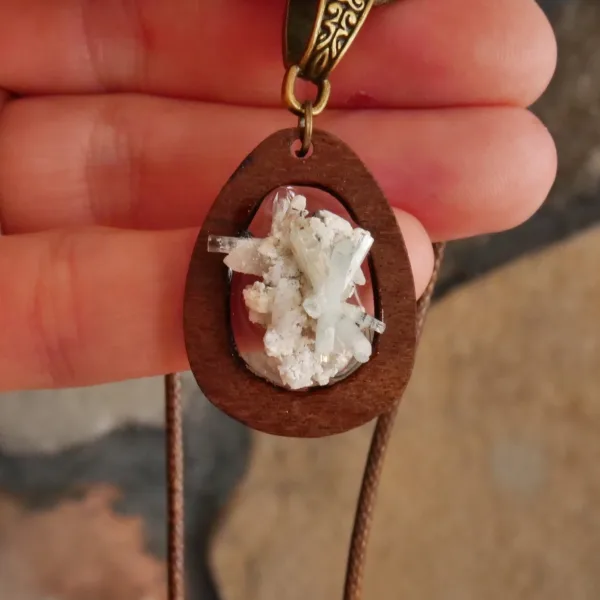This unique and stunning necklace was handmade by an artisan in KwaZulu-Natal, South Africa. This pendant features a delicate cluster of perfectly terminated aquamarine rods affixed to a hand cut wood setting. Hanging from a 16″ waxed cord, this necklace is a truly one of a kind. The local artisans of South Africa have a unique and organic style, and I am proud to support their industry and offer these in the shop.