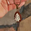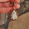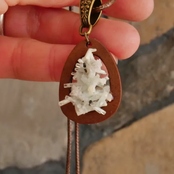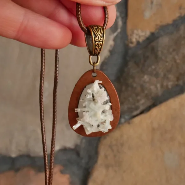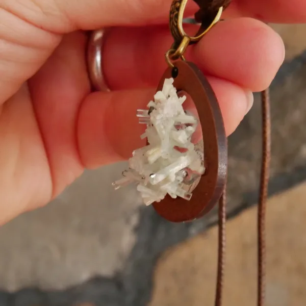 This unique and stunning necklace was handmade by an artisan in KwaZulu-Natal, South Africa. This pendant features a delicate cluster of perfectly terminated aquamarine rods affixed to a hand cut wood setting. Hanging from a 16″ waxed cord, this necklace is a truly one of a kind. The local artisans of South Africa have a unique and organic style, and I am proud to support their industry and offer these in the shop.