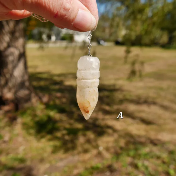 These pendulums are made from Golden Healer Quartz mined and polished in Brazil. These are a smaller size Egyptian-pendulum. Each pendulum crystal measures 1.75-2″ long, and comes with an 8″ silver tone chain.