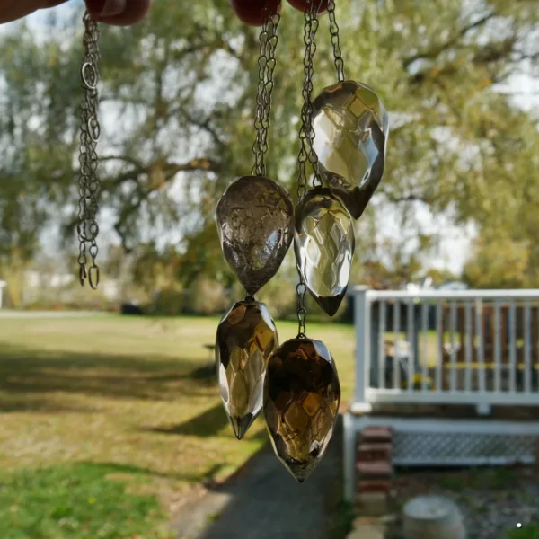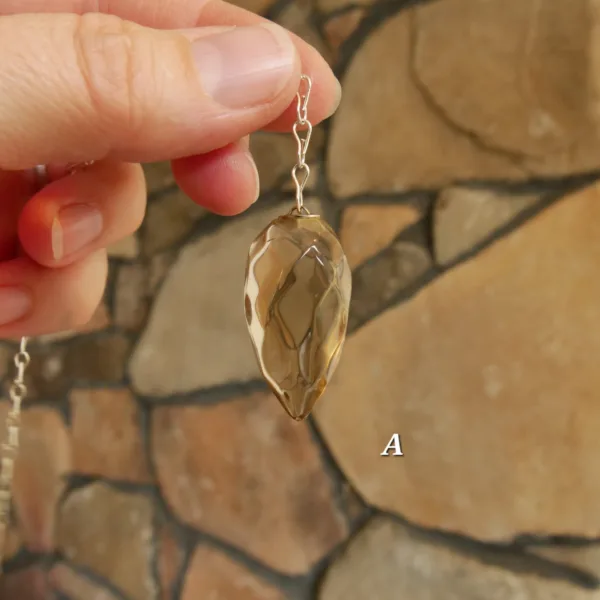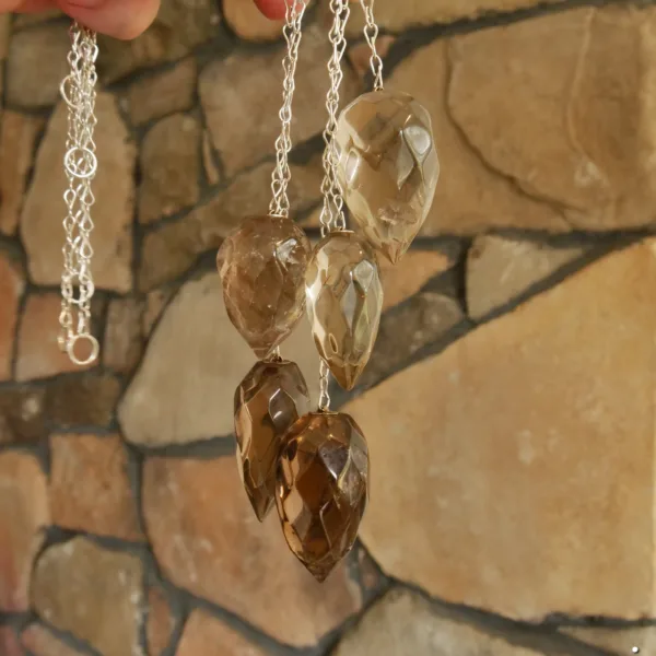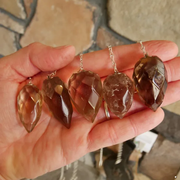 These beautiful pendulums feature sparkling clarity and a unique faceted teardrop shape. Carved from natural Smoky Quartz, these pieces are especially striking when exposed to a bright light source – the facets compliment the clarity of the quartz for an especially striking pendulum. Each crystal measures about 1.5″ and comes with an 8″ silver tone chain. Made from high quality Smoky Quartz, mined and polished in Brazil. Crystal pendulums have traditionally been used as a tool in crystal healing and various metaphysical purposes. Those unfamiliar with pendulums as a tool have been known to enjoy them for decorative purposes, such as suncatchers or talismans.
