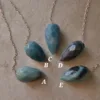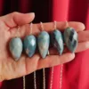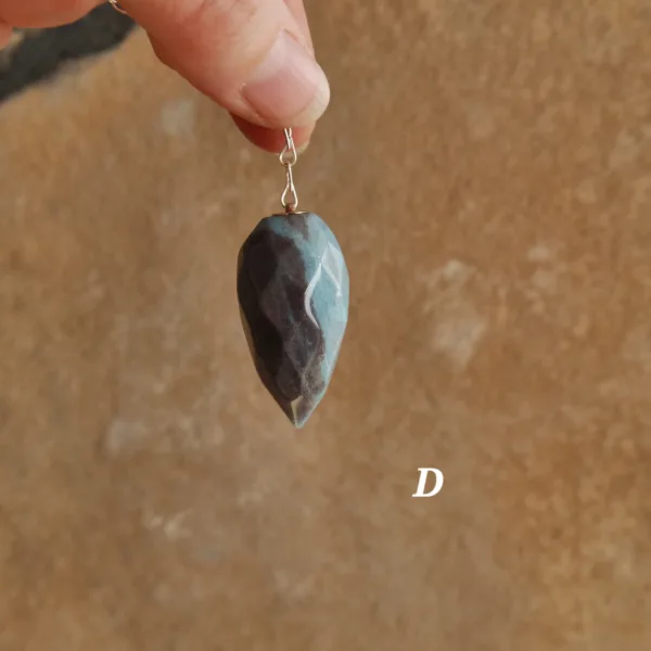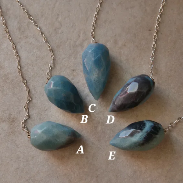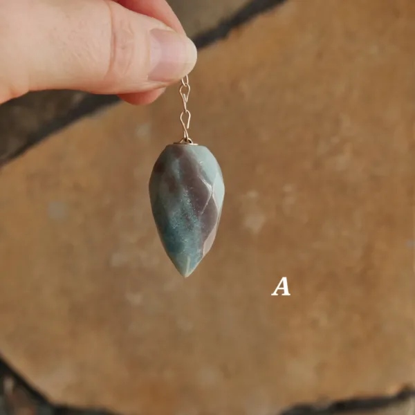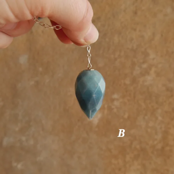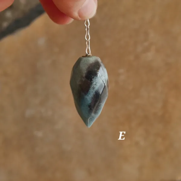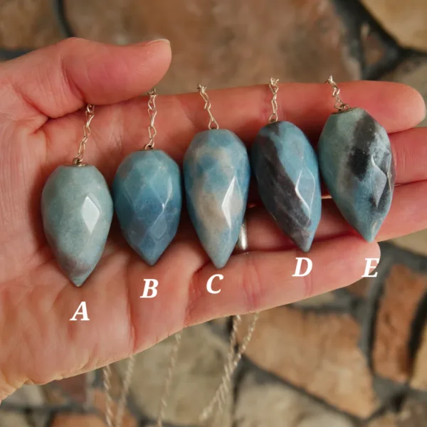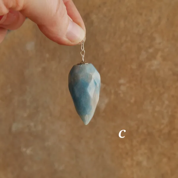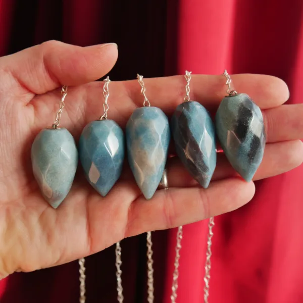 These beautiful pendulums feature sparkling clarity and a unique faceted teardrop shape. Carved from Blue Trolleite, these pieces are especially striking when exposed to a bright light source – the facets complement the light sparkle of this mineral for an especially striking pendulum. Each crystal measures about 1.5″ and comes with an 8″ silver tone chain. Crystal pendulums have traditionally been used as a tool in crystal healing and various metaphysical purposes. Those unfamiliar with pendulums as a tool have been known to enjoy them for decorative purposes, such as suncatchers or talismans. Mined and polished in Brazil.